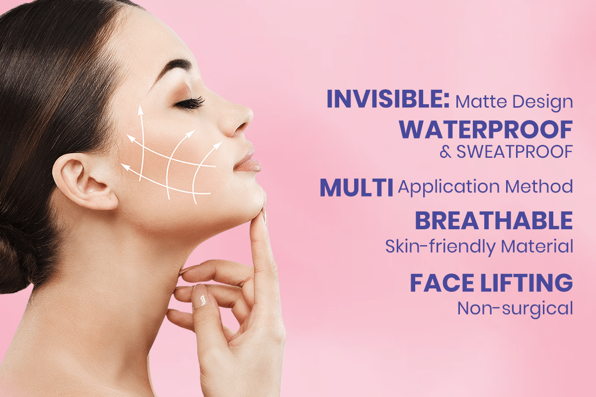 The V-Face Lifting Adhesive Tape offers an instant solution for a face-lifting effect, eliminating the need for surgical procedures. Our product is designed to adhere gently to the sides of your face, lifting and pulling your skin upwards and backwards, creating a more V-shaped appearance, all while being gentle on the skin.