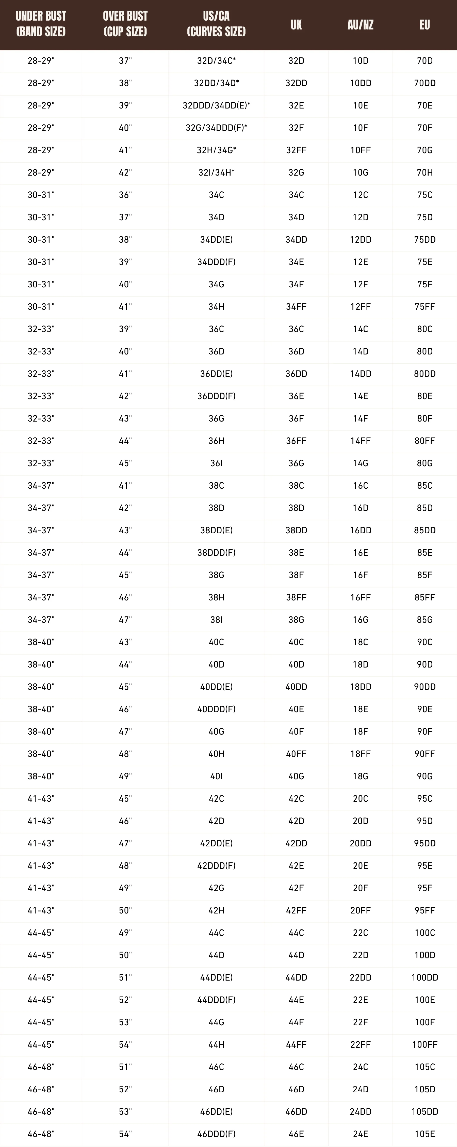 Example:Ā If your underbust measures 30-31" and your bust measures 38", your recommended size isĀ 34DD (E).