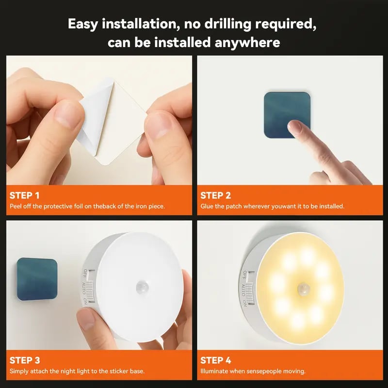 Package Contents: The night light set includes an instruction manual, self-adhesive iron plate, USB charging cable, and LED night light. Should the night light malfunction, please contact us at any time for a replacement.