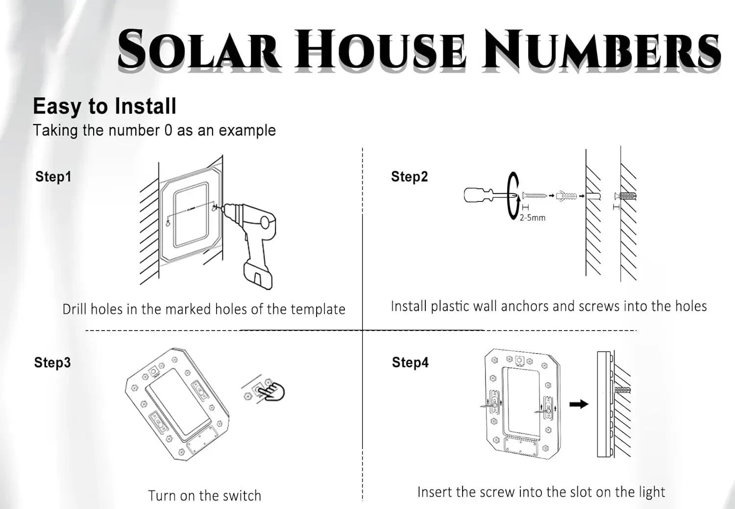 Our large house numbers lights come in a complete set, Each illuminated house number comes with a complete set of screws, installation manual, and punched positioning paper. This means that there is no need to purchase additional parts. But using the address numbers requires drilling holes at the installation location, and drilling equipment needs to be prepared by oneself.