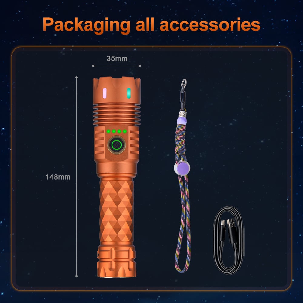 Whether you're navigating dark trails while camping, needing a flashlight during an emergency, or illuminating your backyard, this high-lumen LED flashlight is designed for maximum performance and durability. It’s your go-to companion for: