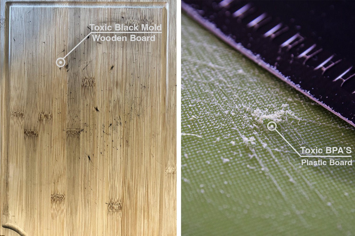 Every time you cut on a plastic board, millions of tiny plastic particles shave off, when ingested damaging your gut and hormones. Wooden boards are no better—they absorb liquids from raw foods, growing bacteria, mold, and germs in the cuts and grooves. They're nearly impossible to clean properly and far from sanitary.
