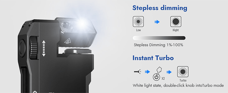Stepless Dimming & Lockout: Turn the knob for infinite brightness control; double-click for instant turbo mode; lockout function prevents accidental activation.